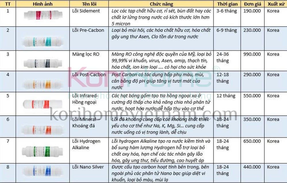 (*) Thời gian thay thế lõi lọc trên được ước tính căn cứ vào bình quân mức tiêu thụ trung bình : 10 lít nước tinh khiết/ngày